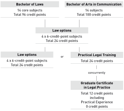 The course comprises 244 credit points. It allows students to graduate with the separate degrees of Bachelor of Arts in Communication (Journalism) and Bachelor of Laws. The study components for course completion are as follows: