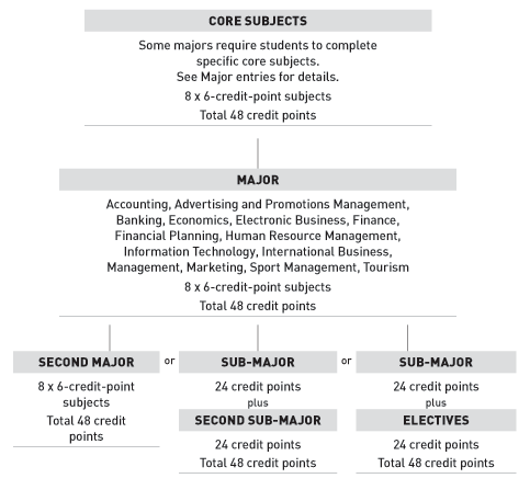 Students must complete 144 credit points, comprising eight foundation core subjects (48 credit points), a major (48 credit points), and either a second major (48 credit points), or two sub-majors (24 credit points each), or a single sub-major (24 credit points) in conjunction with elective subjects (24 credit points).