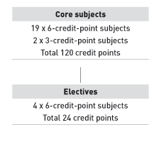 Students must complete a total of 144 credit points made up of 24 subjects, comprising 20 core and four elective subjects.