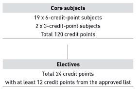 All students must complete a total of 144 credit points made up of 24 subjects, comprising 20 core and four elective subjects.