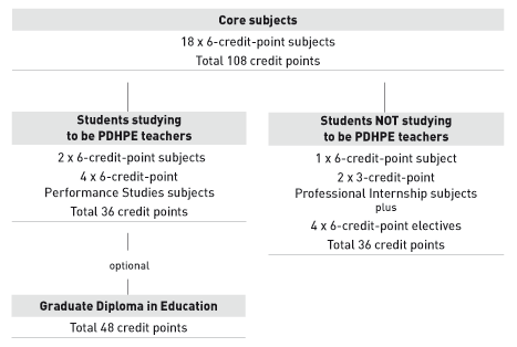 Students choose four electives, appropriate to their chosen career, to complement the core subjects in the degree. Students studying to be a physical education teacher must take the Performance Studies subjects as electives.