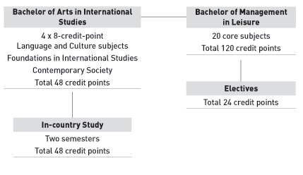 Students must complete 240 credit points of study, comprising 144 credit points relating to the Bachelor of Management in Leisure and 96 credit points relating to the Bachelor of Arts in International Studies. For full details of the Bachelor of Management in Leisure component of the combined degree, refer to the Bachelor of Management in Leisure (C10039).